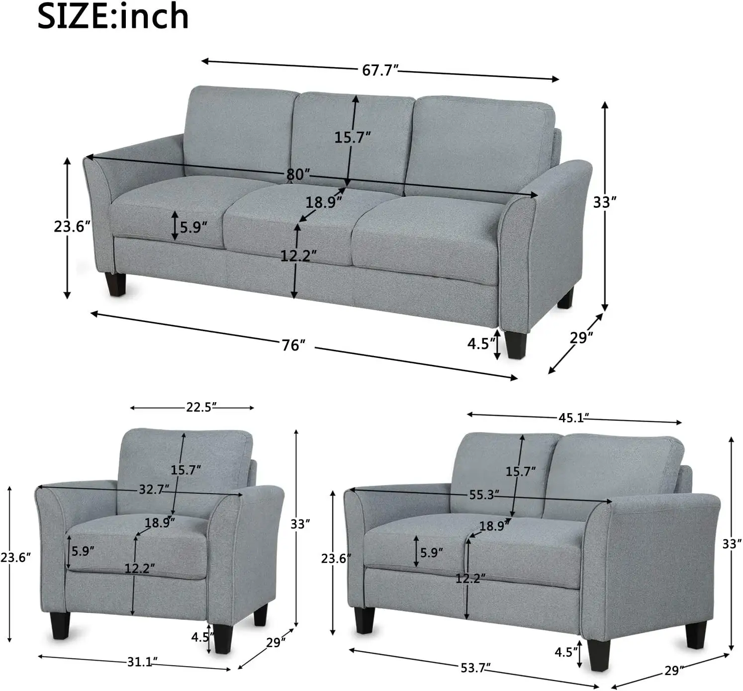 Merax 3 Piece Sectional Sofa Set, Living Room Furniture Set Sofa Couch Set Include Armchair Loveseat Couch Tufted Cushions for Living Room Bedroom,Gray