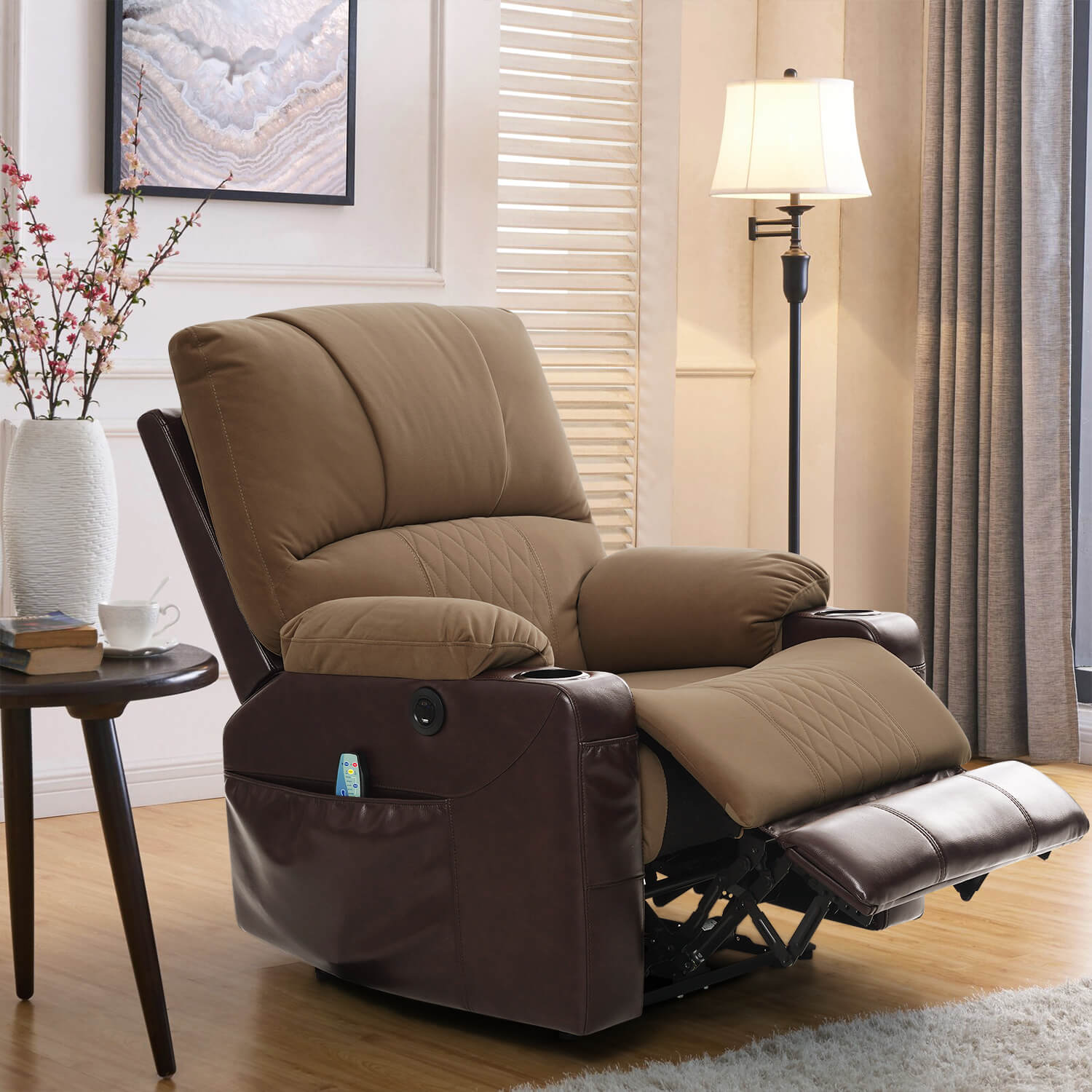 The seating area of this wall hugger recliner is upholstered in soft, breathable, skin-friendly fabric. Sink into its ultra-thick plush cushions and indulge in ultimate relaxation. And the color-blocked design adds a touch of fashion and elegance to your living space.